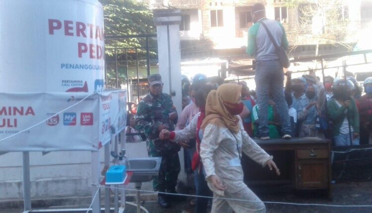 Patrolicia.com/Sorong, Papua Barat.– Dalam rangka mencegah penyebaran dan penularan Covid-19, Babisa Koramil 1802-04/Seget. Serma Yudi melaksanakan kegiatan protokol kesehatan masyarakat, di kantor dinas kependudukan cacatan sipil Kota Sorong. Jumat (31/08/2020).