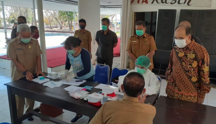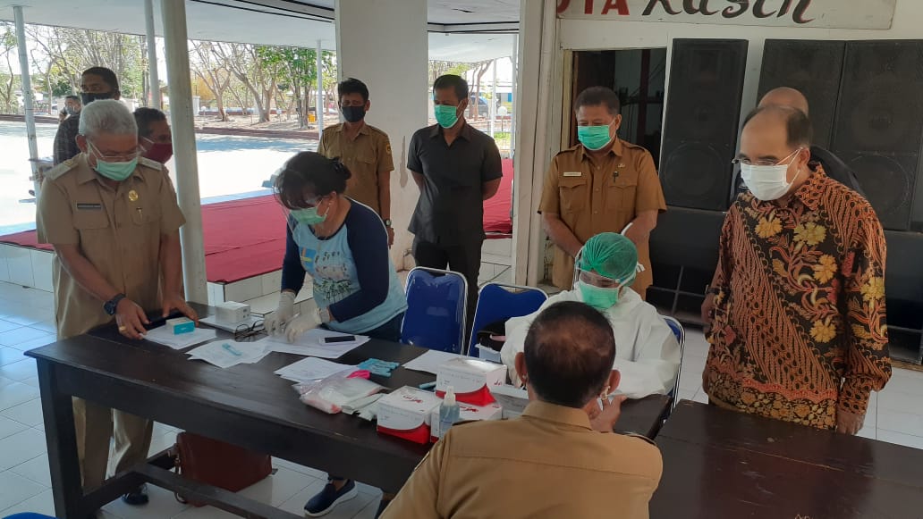 Wali Kota Kupang, Dr. Jefirstson R. Riwu Kore, M.M., M.H., dan Wakil Wali Kota Kupang, dr. Hermanus Man didampingi Sekda Kota Kupang, Fahrensy P. Funay, S.E., M.Si., meninjau pelaksanaan proses Rapid Test bagi ASN lingkup pemerintahan Kota Kupang. Rapid Tes Massal bagi ASN ini diselenggarakan tim gugus tugas penanganan Covid-19 Kota Kupang bersama Dinas Kesehatan Kota Kupang, bertempat di podium lapangan upacara kantor Wali Kota Kupang, Selasa (22/9).