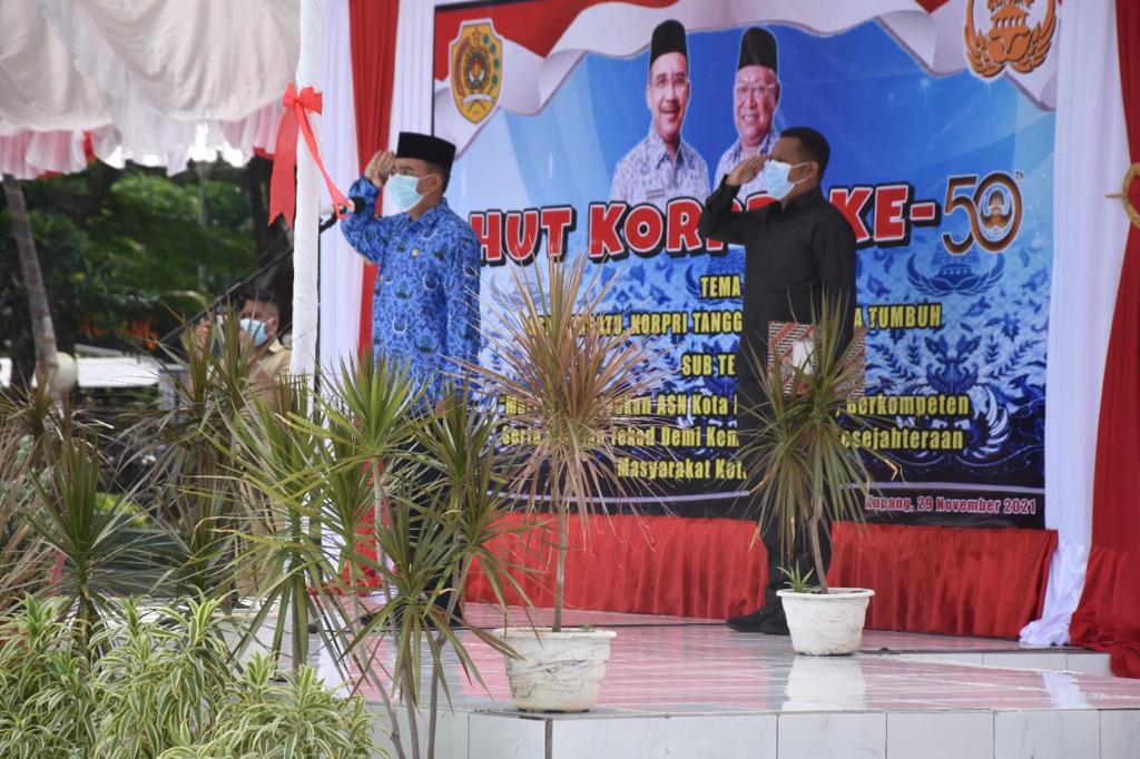 Patrolicia com/kota Kupang. Pemerintah Kota Kupang menyelenggarakan Upacara Peringatan Hari Ulang Tahun (HUT) ke 50 Korps Pegawai Negeri Republik Indonesia (Korpri) dengan tema “ASN Bersatu, Korpri Tangguh, Indonesia Tumbuh”, Senin (29/11) bertempat di Lapangan Upacara Kantor Wali Kota Kupang. Bertindak selaku Inspektur Upacara, Wali Kota Kupang, Dr. Jefirstson R. Riwu Kore, MM., MH., dan komandan upacara, Staf Ahli Walikota Kupang Bidang Kemasyarakatan dan Sumber Daya Manusia, Thomas Didimus Dagang, S.Sos. M.Si.